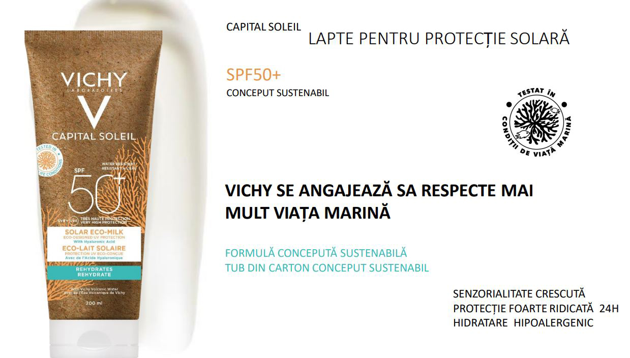 Apa Vulcanica Vichy si Acid Hialuronic + Filtre UV TOLERANTA SI SIGURANTA OPTIMA Noul produs, Capital Soleil LAPTE DE PROTECTIE CONCEPUT SUSTENABIL, este hipoalergenic si testat sub control dermatologic pe pielea sensibila. Este potrivit atat pentru fata, cat si pentru corp. Pentru toata familia. SENZORIALITATE RIDICATA. Fara compromisuri asupra senzorialitatii: textura LAPTELE SOLAR CONCEPUT SUSTENABIL nu lasa urme albe, este rapid absorbita si are un parfum placut, conceput sustenabil.