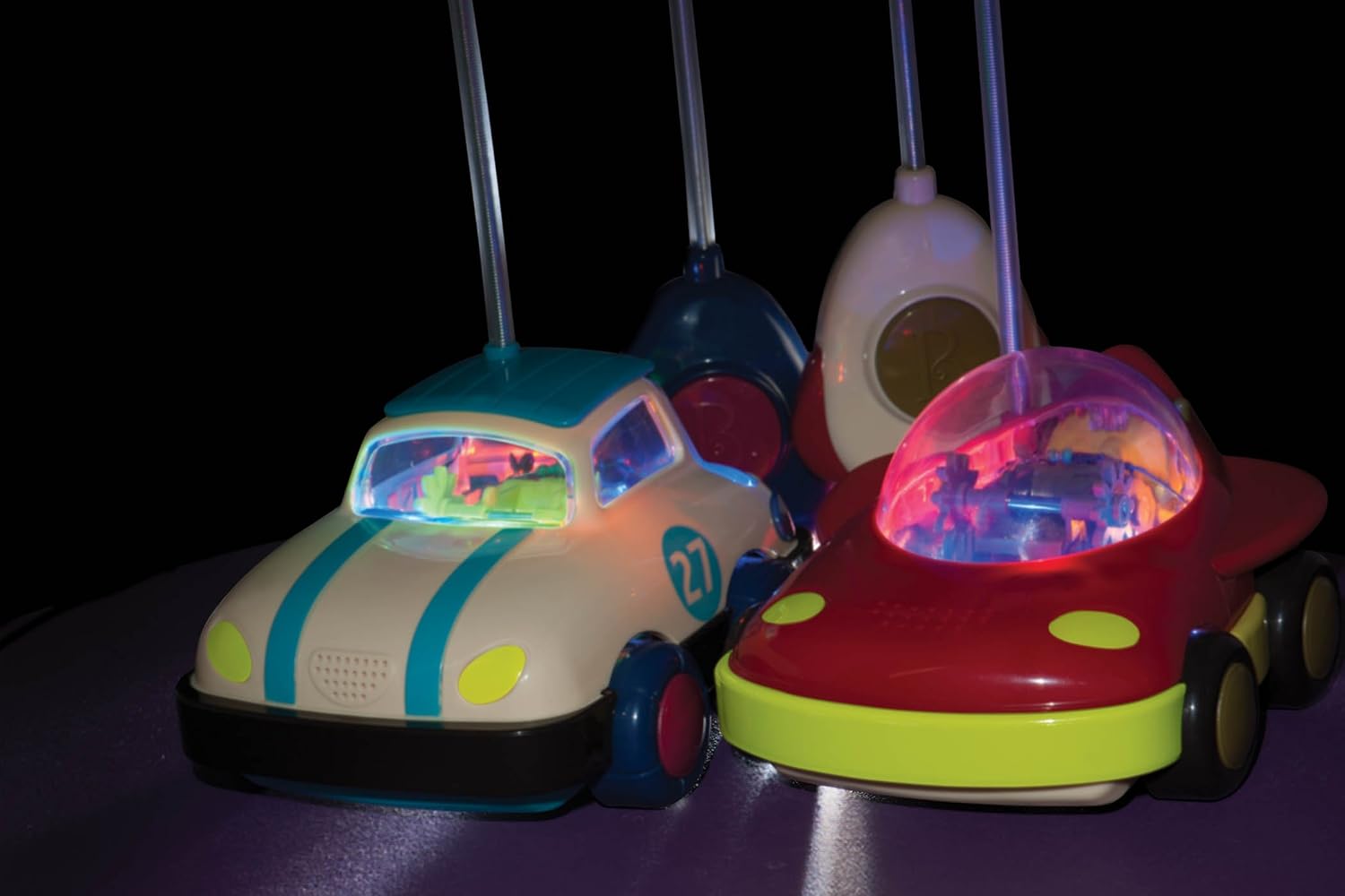 Masinuta cu telecomanda se controleaza cu un singur buton, claxoneaza, se invarte iar interiorul lumineaza in diferite.